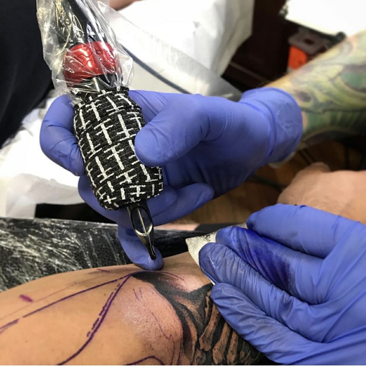 Клейтная повязка для татуировки-это эластичная повязка из 90% нетканой ткани и 10% спандекса, это клейкая повязка. Он часто используется для обертывания ручки татуировки, которая помогает предотвратить проскальзывание ручки во время использования и увеличивает трение пальцев, что может помочь вам более точно нарисовать конструкции татуировки.